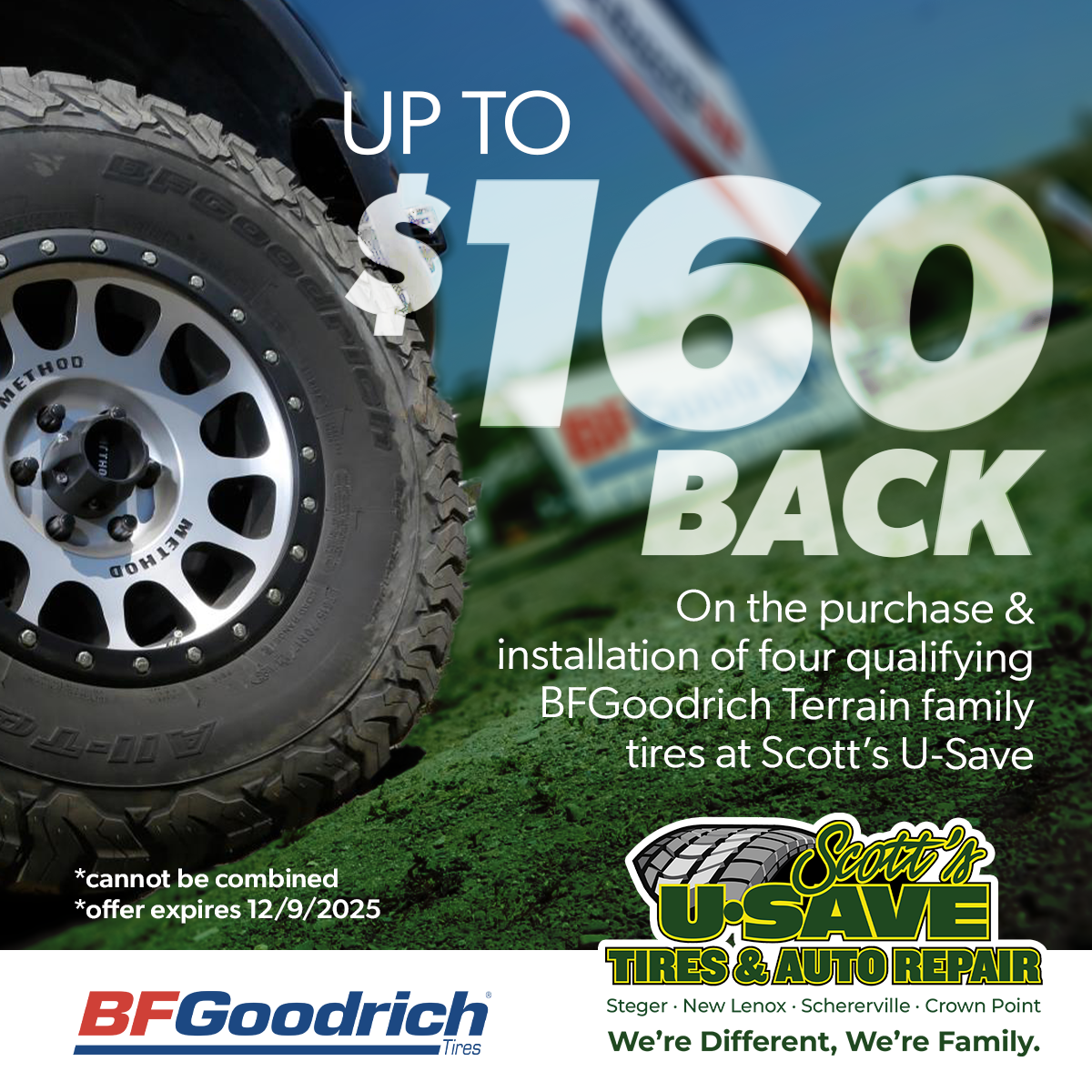 Receive up to $160 back on the purchase of four qualifying BFGoodrich Terrain family tires in the form of rebates